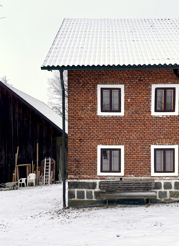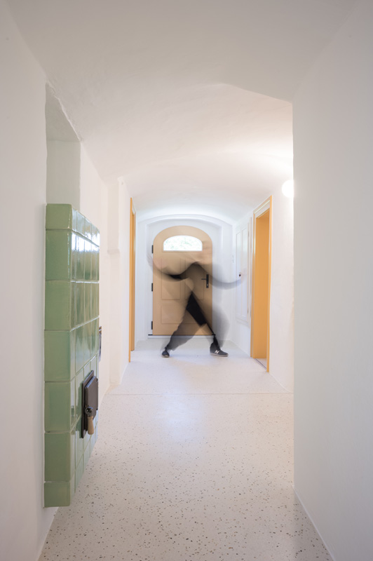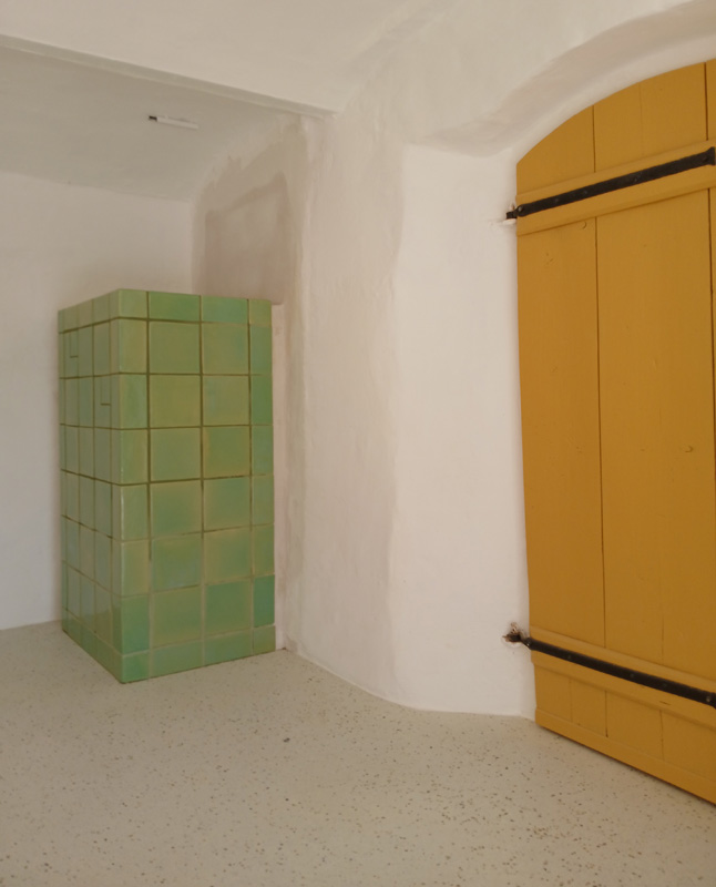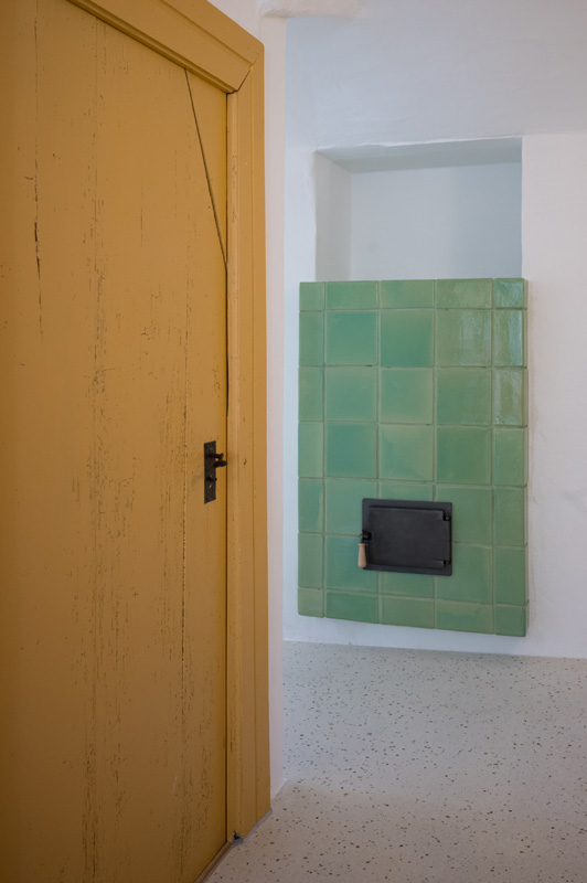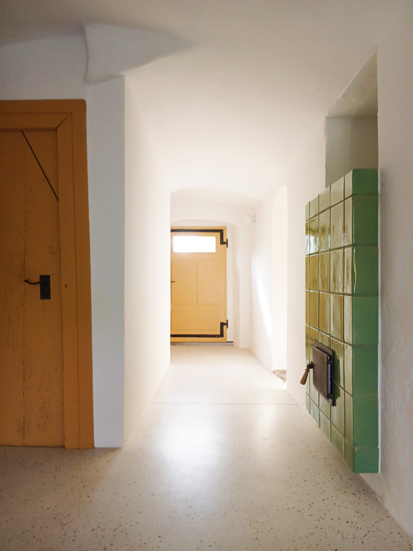 Vom Flur aus zu bestückender, durchgebauter ofenkörper in einem alten